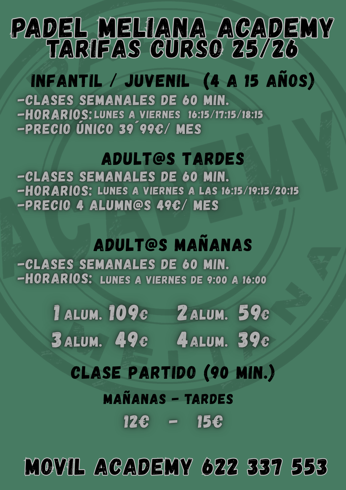 TARIFAS CLASES Y ESCUELA PADEL